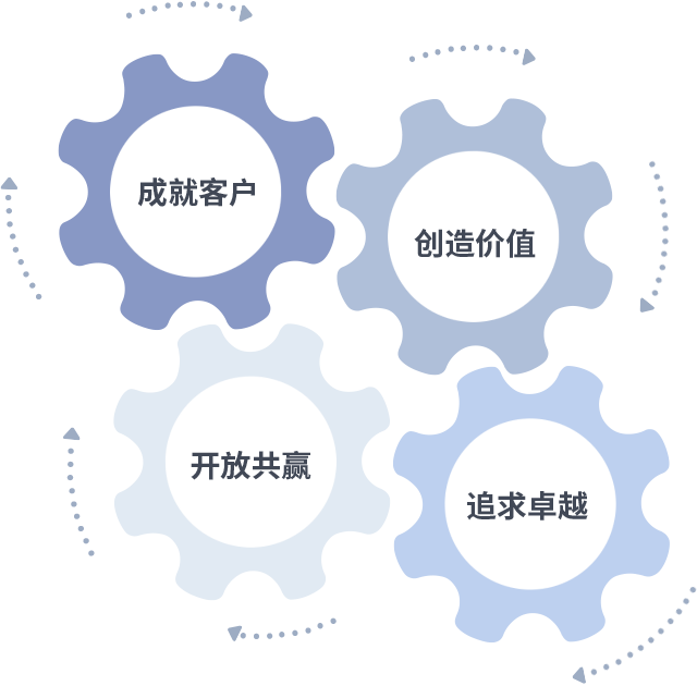 成就客户是一切决策的出发点,创造价值是衡量所有工作的标准,追求卓越是royal皇家88做事做人的态度,开放共赢是royal皇家88的格局也是最终的结果。价值观的齿轮环环相扣,推动着组织里的每个人不断向前。